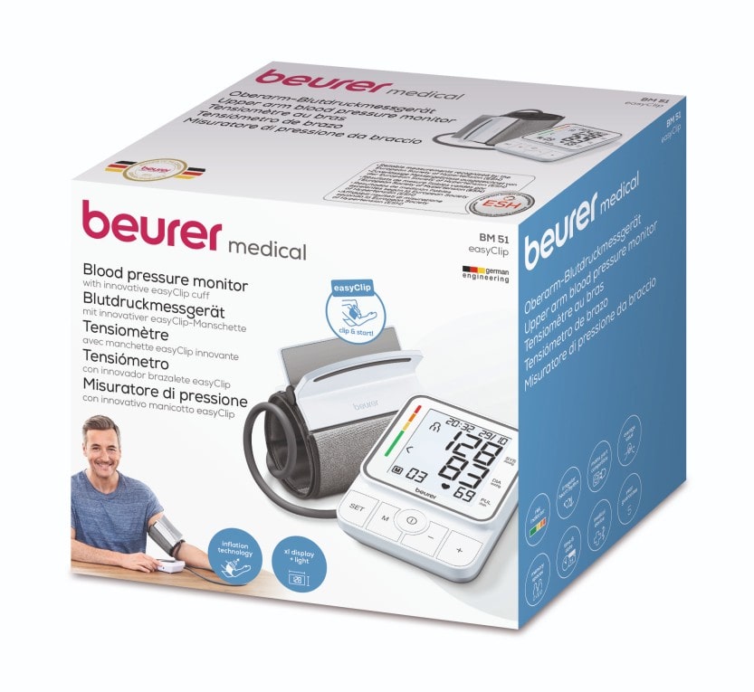 دیگر نیازی به کاف دست و پا گیر برای اندازه گیری نیست، کاف به راحتی به بازو وصل می شوند: فشارسنج تمام اتوماتیک BM51 از Beurer مجهز به کاف ابتکاری easyClip است که می تواند تنها با یک دست قرار گیرد. برای اندازه گیری سریع